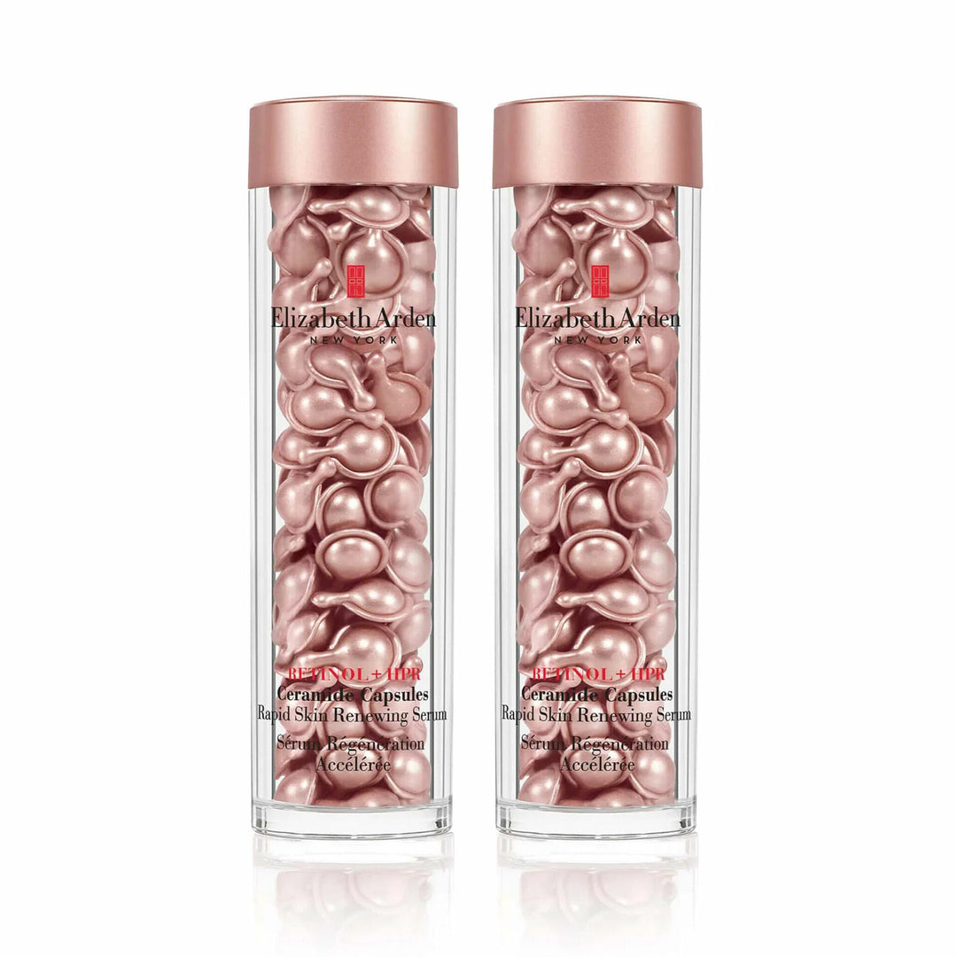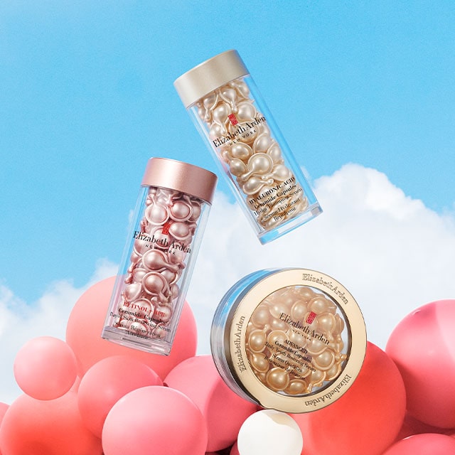 Elizabeth Arden Ceramide Capsules products on red gift boxes with gold ribbon featured along a deep red curtain back drop Elizabeth Arden Ceramide Capsules products on red gift boxes with gold ribbon featured along a deep red curtain back drop