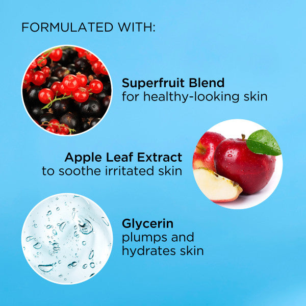 For healthier, soothed and plumped skin. Key ingredients includes apple leaf extract, superfruit blend, and glycerin