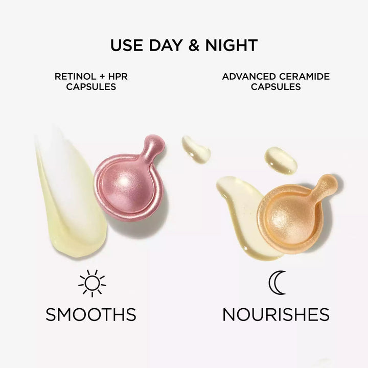 Use Day and Night. Retinol HPR Capsules for day to smooth and Advanced Ceramide Capsules at night to nourish your skin.