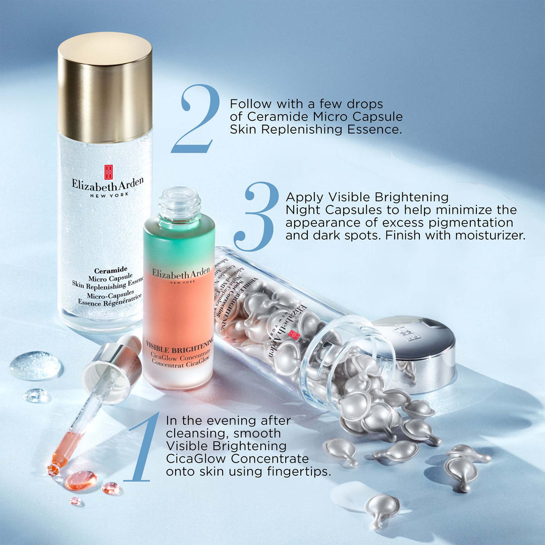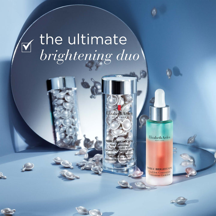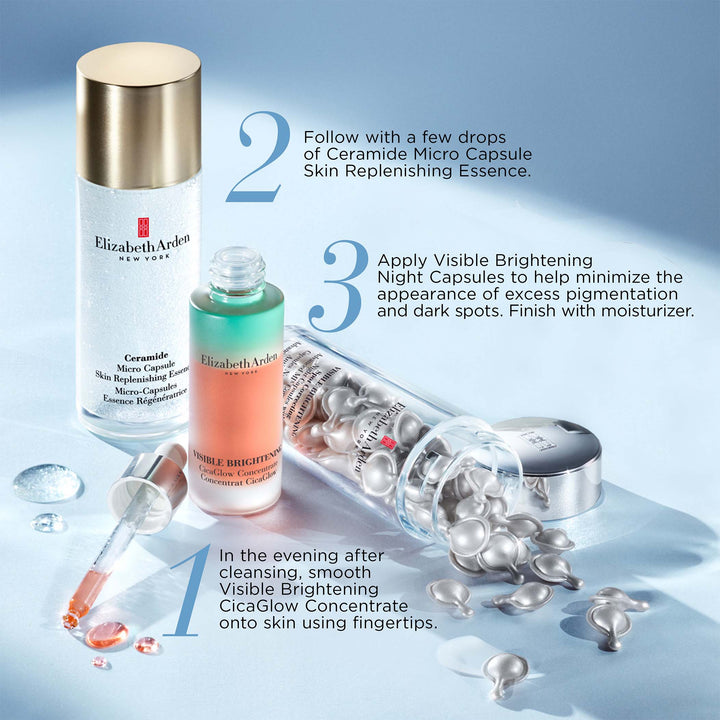 Next-generation skin brightening capsules work overnight to diminish the number, size & intensity of dark spots.